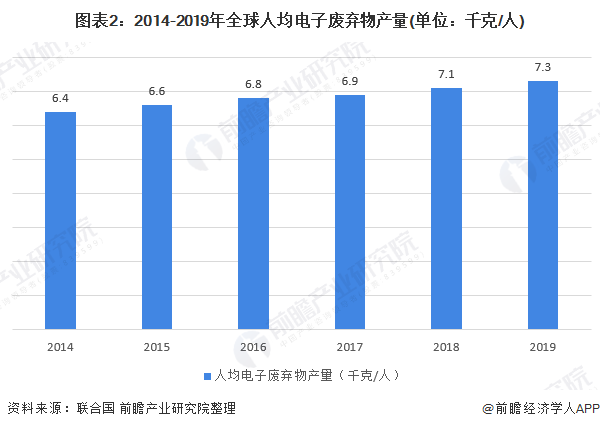 從人均電子廢棄物產(chǎn)量來(lái)看,2014-2019年全球人均電子廢棄物產(chǎn)量逐年增加,2019年達(dá)到7.3千克/人。